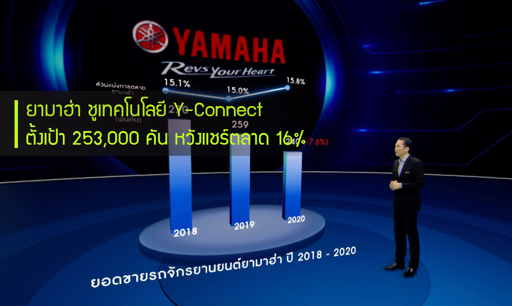 มร.เท็ตสึยะ โนซากิ ประธานกรรมการบริหาร บริษัท ไทยยามาฮ่ามอเตอร์ จำกัด กล่าวถึงความสำเร็จของยามาฮ่าในปีที่ผ่านมาว่า“จากการแพร่ระบาดของเชื้อโคโรน่าไวรัส 2019 ในปีที่ผ่านมาเป็นปัจจัยสำคัญที่ทำให้ภาพรวมของตลาดรถจักรยานยนต์ มียอดจดทะเบียนปิดตัวเลขอยู่ที่ 1.52 ล้านคัน ลดลงจากปีก่อนหน้า 12% โดยเป็นตัวเลขของรถจักรยานยนต์ยามาฮ่าทั้งสิ้น 240,000 คัน ลดลง 7.6% เมื่อเทียบกับปีก่อนหน้า ซึ่งเป็นอัตราเติบโตที่เหนือกว่าภาพรวมของตลาด ทั้งยังสามารถขยับมาร์เก็ตแชร์เพิ่มขึ้นเป็น 15.8% ซึ่งเป็นการเติบโตขึ้นในทุกเซ็กเมนต์ของยามาฮ่า เป็นผลจากการเดินหน้านโยบายด้านการขายและการทำตลาดอย่างเข้มข้นนั่นเอง”