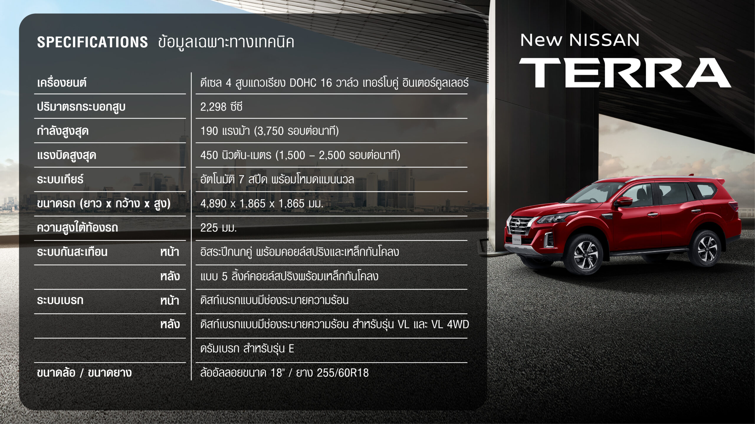 นิสสัน เทอร์ร่า ใหม่ พัฒนาจากประสบการณ์กว่า 60 ปี ด้านรถยนต์อเนกประสงค์ ของนิสสัน สำหรับประเทศไทย นิสสันเลือกใช้เครื่องยนต์ YS23DDTT ขนาด 2.3 ลิตร ทวินเทอร์โบ ให้กำลังสูงสุด 190 แรงม้า (Ps) แรงบิดสูงสุด 450 นิวตัน-เมตร (Nm) ตั้งแต่ 1,500 รอบต่อนาที ที่ให้สมรรถนะสูง ประหยัดน้ำมัน และเนื่องจากการทำงานของเครื่องยนต์ทวินเทอร์โบนี้มีมีแรงสั่นสะเทือนน้อยจึงช่วยลดเสียงรบกวนที่เข้ามาในห้องโดยสาร ทำให้ผู้ขับขี่รู้สึกสบายตลอดการเดินทาง เกียร์อัตโนมัติ 7 สปีด ที่ทำให้การออกตัว เร่งแซง หรือการขับในเมืองเป็นไปอย่างราบรื่น แต่เต็มไปด้วยกำลังที่ให้ความมั่นใจในทุกเส้นทางแมนนวลโหมด             (M mode) ยิ่งทำให้การขับขี่สนุกสนานมากกว่าเดิม นิสสัน เทอร์ร่า ใหม่ รองรับน้ำมันดีเซลทุกชนิดทั้ง B7, B10 และ B20 และเปลี่ยนถ่ายน้ำมันเครื่องทุก 20,000 กิโลเมตร***