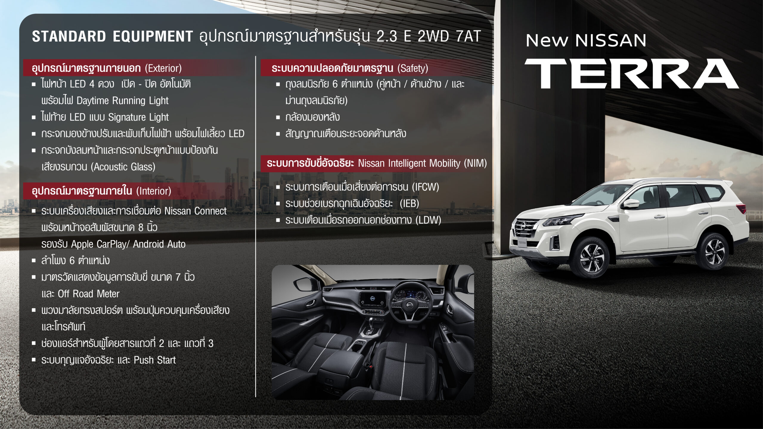 นิสสัน เทอร์ร่า ใหม่ รถอเนกประสงค์สำหรับครอบครัวที่พร้อมพาทุกคนไปทุกเส้นทาง ภายนอกดีไซน์ใหม่สะท้อนความละเอียดประณีตและโมเดิร์น ภายในดีไซน์ภายในใหม่เรียบหรูดูพรีเมียมกว่าเดิม สมรรถนะการขับขี่โดดเด่น ทนทาน ให้ความสะดวกสบายด้วยระบบเอ็นเตอร์เทนเมนท์คุณภาพสูงพร้อมเทคโนโลยีความปลอดภัย 360 องศา ดูแลตลอดการขับขี่ ครบกว่ารถยนต์อเนกประสงค์ในระดับเดียวกัน