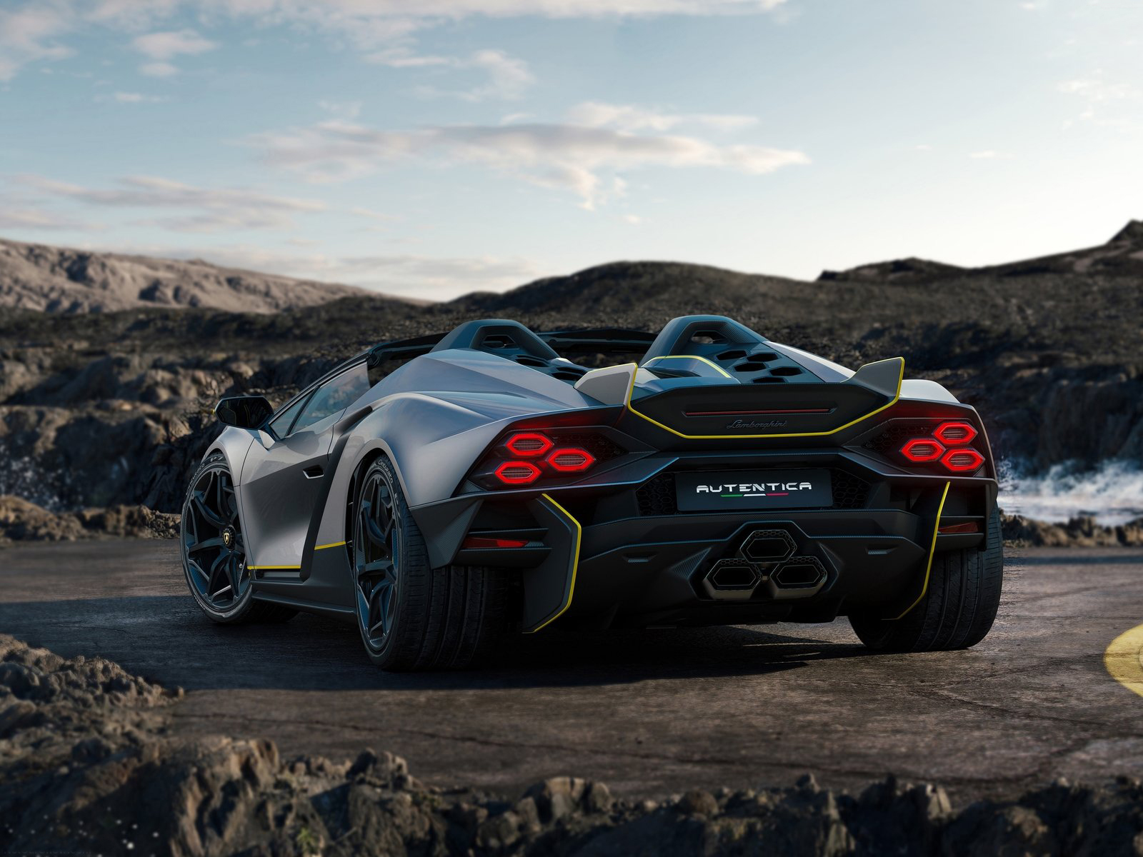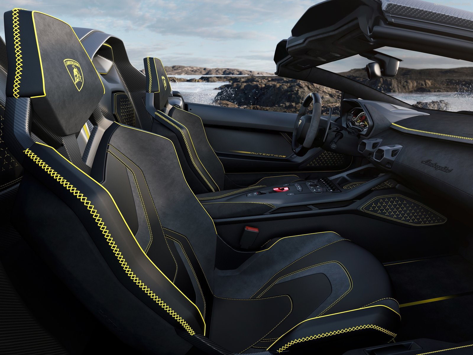 ในแนวทางเดียวกัน เขายังคงรักษาเอกลักษณ์เฉพาะตัวไว้อย่างครบถ้วน Lamborghini Auténtica โรดสเตอร์มีตัวถังสี Grigio Titans พร้อมรายละเอียดในสี Matt Black และสี Giallo Auge ซึ่งบนคาลิปเปอร์เบรกก็เป็นสีเดียวกัน รวมถึงองค์ประกอบหลักแอโรไดนามิกส์ ซึ่งสปลิตเตอร์ด้านหน้าและปีกหลังที่ได้รับมาจากมอเตอร์สปอร์ตซึ่งช่วยปรับโหลดแอโรไดนามิกส์ให้เหมาะสม ขนาบข้างด้วยครีบคู่ รูปลักษณ์ของรถมีเอกลักษณ์เฉพาะตัวด้วยโดมสองอันพร้อมโรลบาร์ในตัว ซึ่งได้รับแรงบันดาลใจจากรถแข่งรุ่นเปิดประทุนในอดีต การตกแต่งภายในแบบเปิดโล่งโดดเด่นด้วยลายปัก Giallo Taurus ที่หรูหรา พร้อมเบาะหนัง Nero Ade ที่ตัดกัน และ Nero Cosmus และ Grigio Octans Alcantara สีทูโทน
