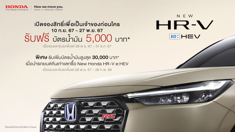 ลูกค้าที่ลงทะเบียนจองสิทธิ์เพื่อเป็นเจ้าของ ฮอนด้า เอชอาร์-วี อี:เอชอีวี ใหม่ ตั้งแต่วันที่ 10 กันยายน 2567 – วันที่ 27 พฤศจิกายน 2567 จะได้รับฟรีบัตรเติมน้ำมันมูลค่า 5,000 บาท* เมื่อทำการจองและรับรถ ตั้งแต่วันที่ 28 พฤศจิกายน 2567 – 31 ธันวาคม 2567*