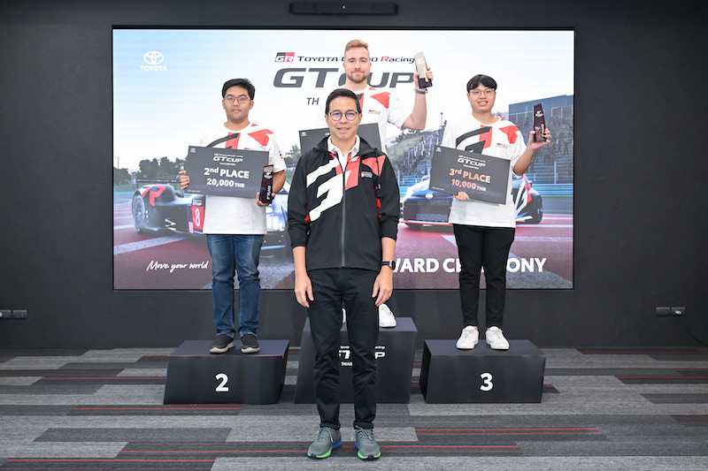 นายณัทธร ศรีนิเวศน์ ผู้ช่วยกรรมการผู้จัดการใหญ่ บริษัท โตโยต้า มอเตอร์ ประเทศไทย จำกัด ร่วมแสดงความยินดี และมอบรางวัลผู้ชนะการแข่งขันอี-มอเตอร์สปอร์ต รอบคัดเลือกตัวแทนประเทศไทย