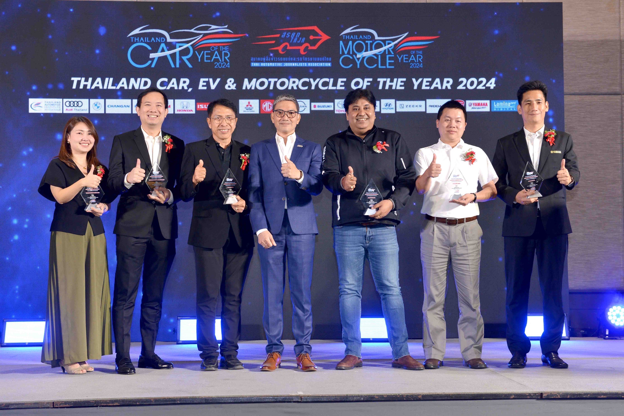 นายภาณุพล กิตติคำรณ ผู้จัดการใหญ่ด้านการค้า นายอุกฤษณ์ ภาควิวรรธ รองผู้จัดการให้ด้านวางแผนการค้า และวางแผนการตลาด บริษัท ไทยยามาฮ่ามอเตอร์ จำกัด ถ่ายภาพร่วมกับนายสุรศักดิ์ จรินทร์ทอง นายกสมาคมผู้สื่อข่าวรถยนต์ และรถจักรยานยนต์ไทย (สรยท.) และคณะกรรมการ สมาคมผู้สื่อข่าวรถยนต์ และรถจักรยานยนต์ไทย (สรยท.) ในงานประกาศผล Thailand Car, EV & Motorcycle of The Year 2024