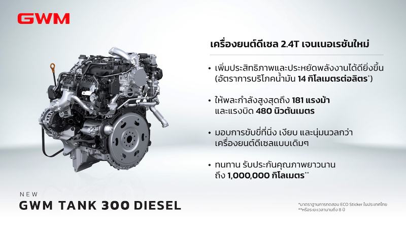 สำหรับรุ่นขับเคลื่อน 2 ล้อ ซึ่งน้ำมันหนึ่งถัง (ดีเซล B7) สามารถขับขี่ได้ระยะทางไกลมากกว่า 1,000 กิโลเมตร ดังนั้นเครื่องยนต์ดีเซล 2.4T ใหม่ของ GWM จึงเป็นตัวเลือกที่น่าสนใจสำหรับผู้ที่มองหารถยนต์ที่มีประสิทธิภาพสูงในการขับขี่ คุ้มค่า และประหยัดพลังงานได้ดียิ่งขึ้น