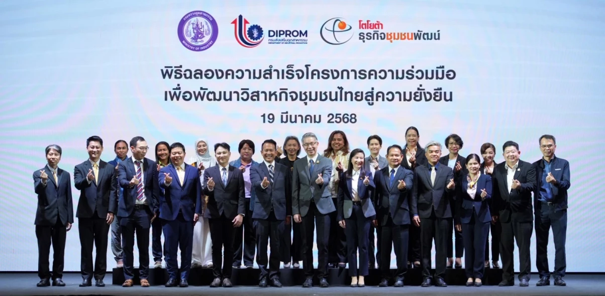 ดร.ณัฐพล รังสิตพล ปลัดกระทรวงอุตสาหกรรม นางสาวณัฏฐิญา เนตยสุภา อธิบดีกรมส่งเสริมอุตสาหกรรม นายสุรภูมิ อุดมวงศ์ รองกรรมการผู้จัดการใหญ่ บริษัท โตโยต้า มอเตอร์ ประเทศไทย จำกัด พร้อมด้วยคณะเจ้าหน้าที่จากกรมส่งเสริมอุตสาหกรรม และคณะผู้บริหารระดับสูง บริษัท โตโยต้า มอเตอร์ ประเทศไทย จำกัด ร่วมเป็นเกียรติภายในงานฉลองความสำเร็จ โครงการความร่วมมือเพื่อพัฒนาวิสาหกิจชุมชนไทยสู่ความยั่งยืน เมื่อวันพุธที่ 19 มีนาคม 2568 ที่ผ่านมา ณ Toyota ALIVE บางนา
