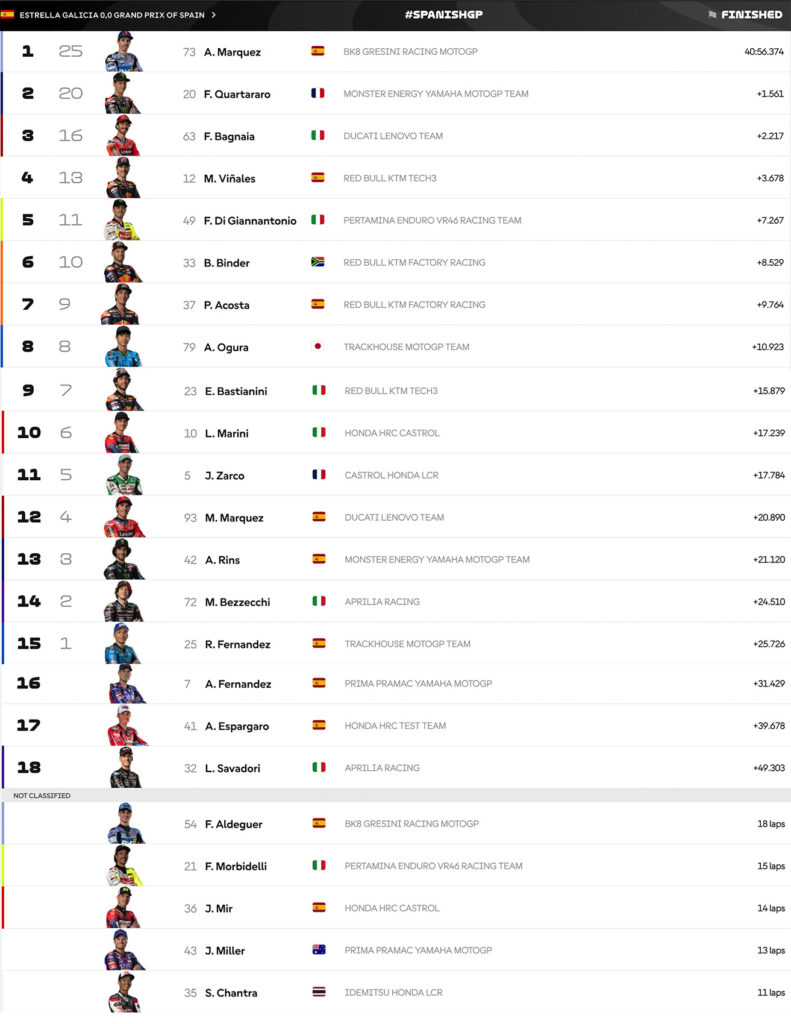เพราะโค้งที่ 6 เห็น Alex Marquez เกือบจะชนกับพี่ชายของเขา นักบิดชาวสเปนต้องเผชิญกับสถานการณ์ที่ร้อนระอุเกินไป แต่ก็สามารถกลับมาแซงขึ้นอันดับ 4 ได้สำเร็จ ขณะที่ Marc Marquez และ Bagnaia เข้าปะทะกันที่ Jerez แต่ไม่เกิดปัญหา
