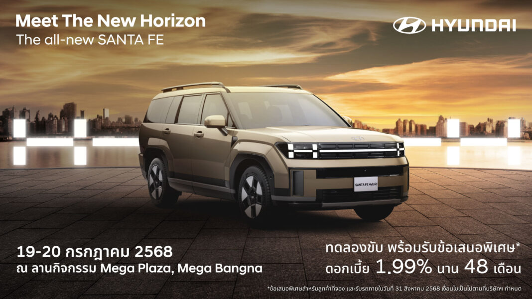 กรุงเทพฯ 18 กรกฎาคม 2568 – หลังจากสร้างแรงสั่นสะเทือนครั้งใหญ่ให้กับวงการยานยนต์ไทยในการเปิดตัว “The all-new SANTA FE” ที่ได้รับกระแสตอบรับอย่างล้นหลามจากดีไซน์ทรงเหลี่ยม (Boxy Design) สุดโฉบเฉี่ยวและขุมพลังไฮบริด 1.6 Turbo 232 แรงม้า ล่าสุด ฮุนได โมบิลิตี้ (ประเทศไทย) เชิญชวนผู้บริโภคสัมผัสยนตรกรรมสุดยอด D-SUV เจเนอเรชันใหม่ที่จะกลายเป็นสัญลักษณ์แห่งวิสัยทัศน์และอนาคตในงาน “The all-new SANTA FE: Meet The New Horizon” ระหว่างวันที่ 19–20 กรกฎาคม 2568 ณ ลานโปรโมชั่น ชั้น 1 ศูนย์การค้าเมกะบางนา