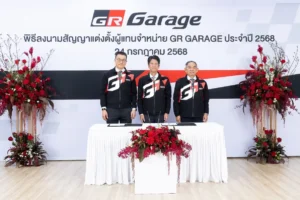 มร. โนริอากิ ยามาชิตะ กรรมการผู้จัดการใหญ่ บริษัท โตโยต้า มอเตอร์ ประเทศไทย จำกัด พร้อมด้วยตัวแทนจากผู้แทนจำหน่ายโตโยต้า ประกอบด้วย คุณพิเทพ จันทรเสรีกุล บริษัท โตโยต้า กรุงไทย จำกัด คุณจิรเดช สมภพรุ่งโรจน์ บริษัท โตโยต้า เค.มอเตอร์ส ผู้จำหน่ายโตโยต้า จำกัด คุณสุชาวดี ประโยชน์อมร ภาณุประภา พร้อมด้วย คุณคาร์ล ออพเพนบอร์น บริษัท โตโยต้า ธนบุรี จำกัด คุณเรืองชัย จิตรสกุล บริษัท โตโยต้าริช จำกัด คุณกมลพงศ์ สงวนตระกูล บริษัท โตโยต้าขอนแก่น ผู้จำหน่ายโตโยต้า จำกัด และ คุณชัยภัทร ณ ระนอง บริษัท โตโยต้าเพิร์ล ผู้จำหน่ายโตโยต้า จำกัด ร่วมเป็นเกียรติในพิธีลงนามสัญญาแต่งตั้งผู้แทนจำหน่าย GR GARAGE ประจำปี 2568 เมื่อวันที่ 24 กรกฎาคม 2568 ณ TOYOTA ALIVE ถนนบางนา-ตราด กม.3