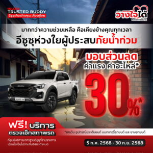 โดยการมอบบริการตรวจเช็กสภาพรถฟรี พร้อมมอบส่วนลดค่าแรง 30% และส่วนลดค่าอะไหล่ 30% (ยกเว้น อุปกรณ์ประดับยนต์ แบตเตอรี่รถยนต์ และยางรถยนต์) ตั้งแต่วันที่ 5 กรกฎาคม 2568 – 30 กันยายน 2568 สำหรับท่านผู้ใช้รถอีซูซุ สามารถนัดหมายล่วงหน้าก่อนเข้ารับบริการได้ที่ศูนย์บริการมาตรฐานอีซูซุที่ร่วมรายการ รวมถึงสอบถามรายละเอียดเพิ่มเติมได้ที่สายด่วนลูกค้าสัมพันธ์ 0-2118-0777 โดยสามารถตรวจสอบศูนย์บริการมาตรฐานอีซูซุที่ร่วมรายการและติดตามข่าวสารของอีซูซุเพิ่มเติมได้ที่ www.isuzu-tis.com หรือ LINE: @isuzuthai