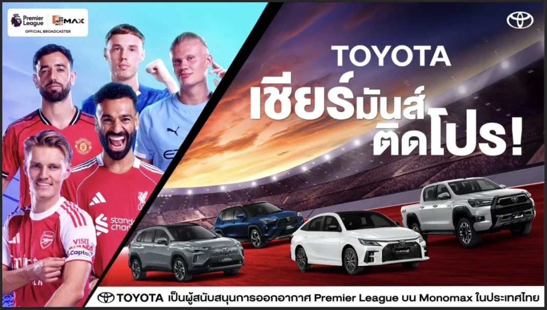 บริษัท โตโยต้า มอเตอร์ ประเทศไทย จำกัด ร่วมมือกับบริษัท โมโนสตรีมมิ่ง จำกัด หรือ Monomax แพลตฟอร์มหลักในการถ่ายทอดสด และ บริษัท จัสมิน อินเตอร์เนชั่นแนล จำกัด (มหาชน) หรือ JAS ผู้ถือลิขสิทธิ์การถ่ายทอดสดฟุตบอลพรีเมียร์ลีก และ เอมิเรตส์ เอฟเอ คัพ อย่างเต็มรูปแบบในประเทศไทย ผนึกกำลังขับเคลื่อน      ประสบการณ์การรับชมฟุตบอลของชาวไทยไปสู่อีกระดับ โดยการเป็นผู้สนับสนุนการออกอากาศ Premier League บน Monomax อย่างเป็นทางการ พร้อมเปิดตัวแคมเปญใหญ่ ‘เชียร์มันส์ ติดโปร’ มอบสิทธิพิเศษมูลค่ากว่า 10 ล้านบาทตลอดฤดูกาล 2025/26