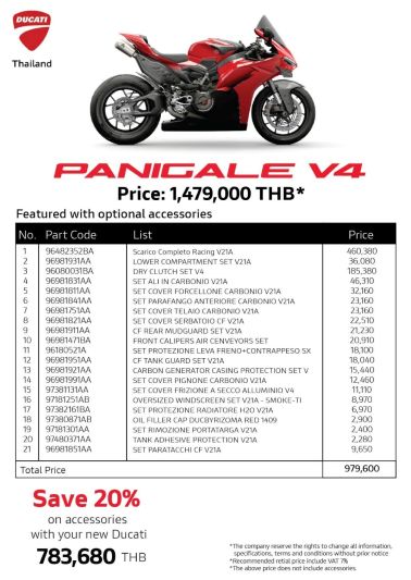 Panigale V4 ซูเปอร์ไบค์ที่ถ่ายทอด DNA จากสนามแข่ง MotoGP สู่ถนน มาพร้อมชุด Performance เต็มรูปแบบ อาทิ Racing Exhaust System, Dry Clutch (คลัทช์แห้ง) และ ชุดแต่งคาร์บอน (Carbon Components)