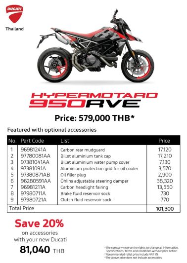Hypermotard 950 RVE ตัวแทนความสนุกสไตล์ Supermoto โดดเด่นด้วยความคล่องตัวสูง มาพร้อมอุปกรณ์เสริมสายสมรรถนะ เช่น Öhlins Steering Damper และชิ้นส่วน Carbon